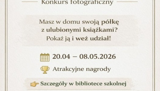 Biblioteka szkolna SP20 zaprasza uczniów klas I–VIII do udziału w konkursie fotograficznym „Moja domowa biblioteczka”. Zdjęcia należy p...