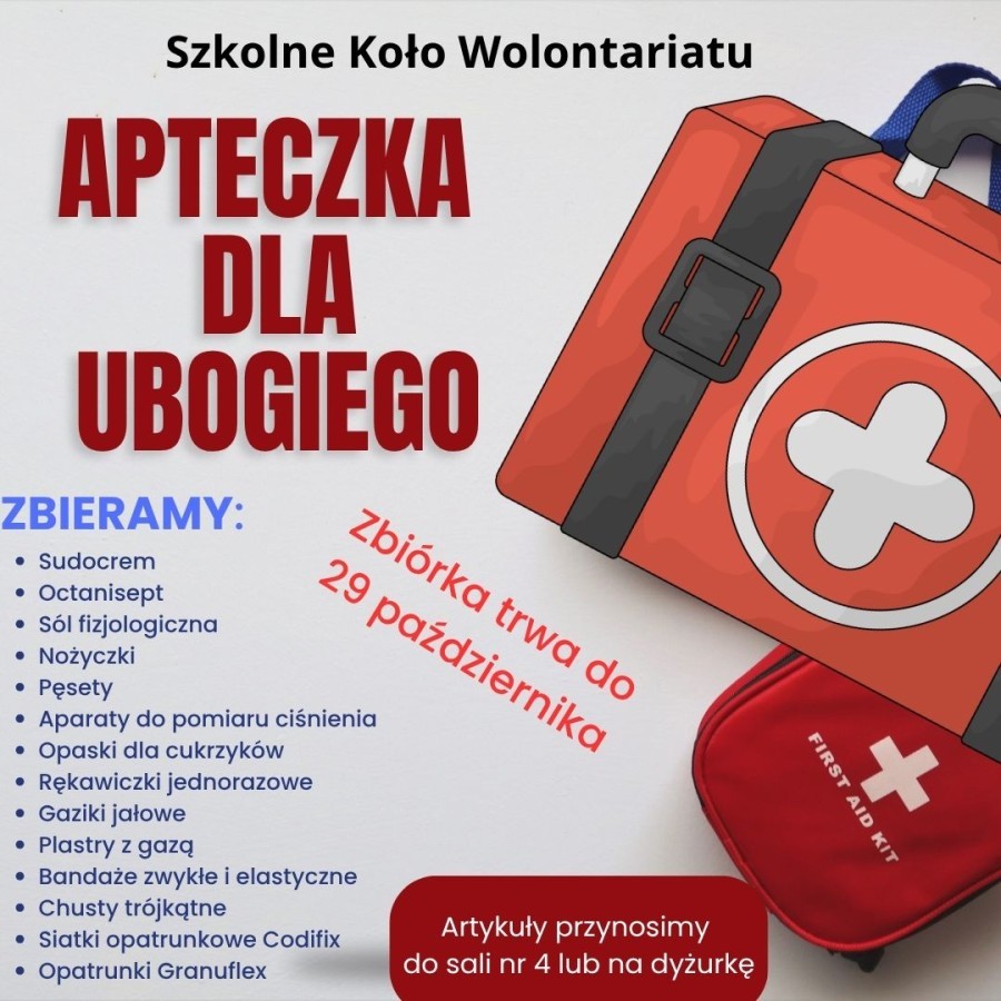 W naszej szkole w dniach 20-29 października 2025 r. odbędzie się zbiórka artykułów potrzebnych do wyposażenia apteczki oraz podstawowych środków opatrunkowych i higienicznych, tj.:
