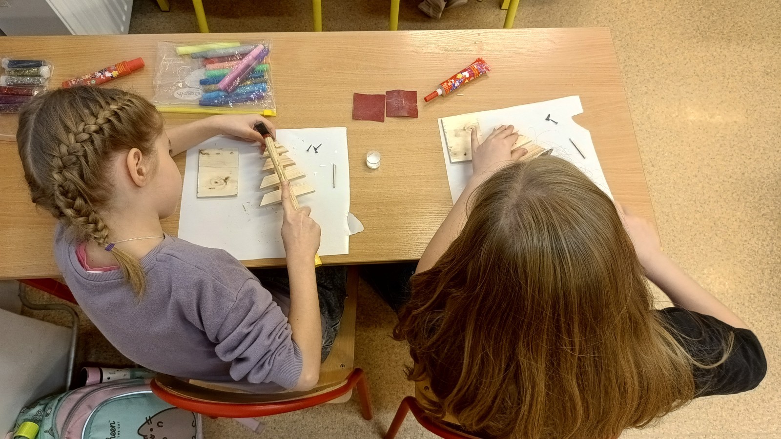 Klasa III B wzięła udział w eko-warsztatach, które były nagrodą za osiągnięcia w ubiegłorocznej edycji konkursu Szanowny Energia i Chroń Klimat. Podczas zajęć dzieci wykonały ekologiczne choinki, które następnie samodzielnie ozdobiły. Panie z firmy Flojamo zaprezentowały uczniom przestrzenną formę wykonania drzewka choinkowego. Uczniowie wykonywali choinki samodzielnie, wykorzystując deseczki i gwoździe.