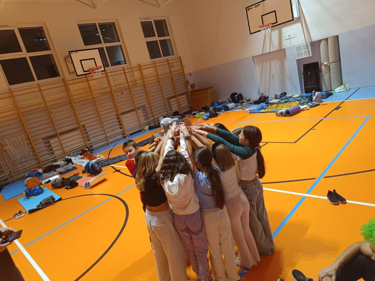 Wszyscy zebraliśmy się wieczorem na sali gimnastycznej, gdzie rozłożyliśmy karimaty i śpiwory.