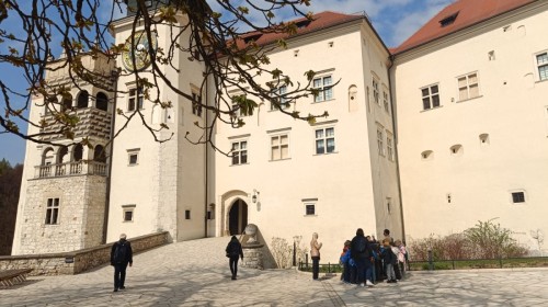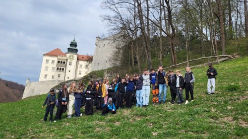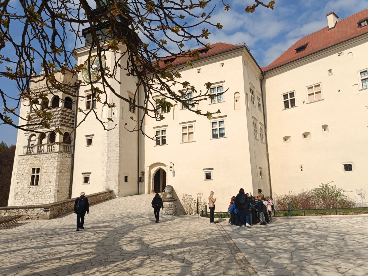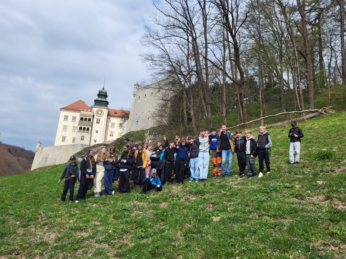 Naszą przygodę rozpoczęliśmy od zwiedzania Zamku w Pieskowej Skale – jednego z najlepiej zachowanych zamków na Szlaku Orlich Gniazd. Tuż obok podziwialiśmy słynną Maczugę Herkulesa – charakterystyczną wapienną skałę o niezwykłym kształcie, będącą jednym z symboli regionu.Kolejnym punktem programu była wizyta w Muzeum Przyrodniczym Ojcowskiego Parku Narodowego, gdzie uczniowie mogli poszerzyć swoją wiedzę na temat fauny, flory oraz historii tego wyjątkowego miejsca.