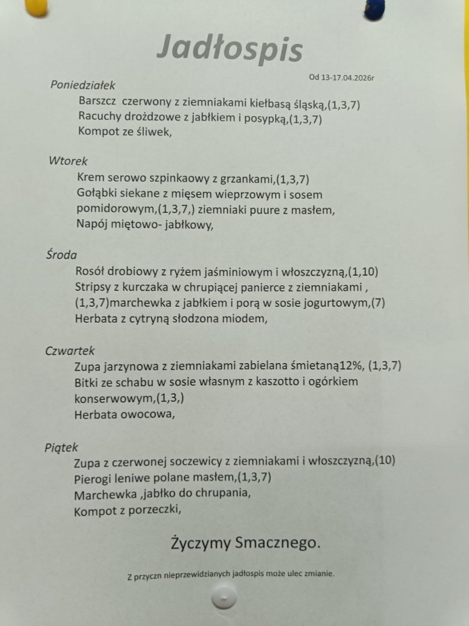 Z przyczyn nieprzewidzianych jadłospis może ulec zmianie.